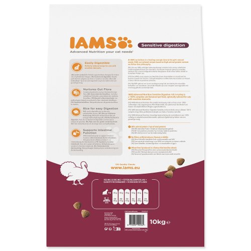 Krmivo IAMS for Vitality Sensitive Digestion pre dospelé a staršie mačky s vysokým obsahom morčacieho mäsa je 100% kompletné a vyvážené , odborníkmi zostavené krmivo, ktoré podporuje sedem znakov zdravia a vitality mačky a pomáha s citlivým trávením . Všetky živiny sú obsiahnuté v lahodnej receptúre s 88% obsahom živočíšnych bielkovín , na ktoré si vaše mačky pochutnajú každý deň.