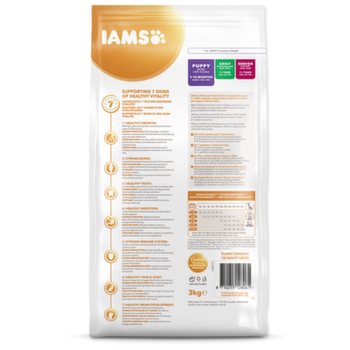 Krmivo IAMS for Vitality pre šteňatá veľkých plemien je 100% kompletné a vyvážené odborníkmi zostavené krmivo , ktoré bude vášmu šteniatku svedčiť. Naša nová a vylepšená receptúra pre šteňatá s čerstvým kuracím mäsom je založená na kvalitných živočíšnych bielkovinách, ktoré boli starostlivo vybrané, aby podporovali sedem znakov zdravej vitality šteňa te.Aby boli šteňatá zdravé, aktívne a plné energie, obsahujú naše lahodné receptúry až 8 bielkovín z kuracieho mäsa (z celkového obsahu bielkovín).