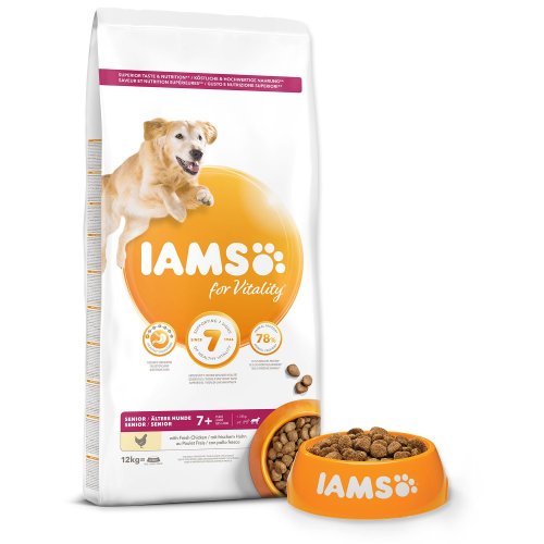 Krmivo IAMS for Vitality pre psích seniorov veľkých plemien je 100% kompletné a vyvážené, odborníkmi zostavené krmivo , ktoré bude vášmu zvieraťu chutiť a svedčiť. Naša nová a vylepšená receptúra pre psích seniorov s čerstvým kuracím mäsom je založená na starostlivo vybraných, kvalitných živočíšnych bielkovinách, ktoré podporujú sedem znakov zdravej vitality psa. Aby bol váš pes zdravý, aktívny a plný energie, obsahujú naše lahodné receptúry až 78% živočíšnych bielkovín (z celkového obsahu bielkovín). Umožnite svojmu miláčikovi užívať si každý deň naplno!