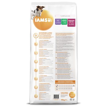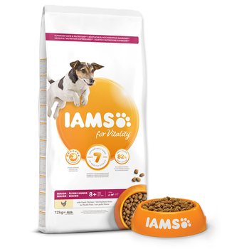 Krmivo IAMS for Vitality pre psích seniorov malých a stredných plemien je 100% kompletné a vyvážené, odborníkmi zostavené krmivo , ktoré bude vášmu zvieraťu chutiť a svedčiť. Naša nová a vylepšená receptúra pre psích seniorov s čerstvým kuracím mäsom je založená na starostlivo vybraných, kvalitných živočíšnych bielkovinách, ktoré podporujú sedem znakov zdravej vitality psa. Aby bol váš pes zdravý, aktívny a plný energie, naše lahodné receptúry obsahujú až 82 % živočíšnych bielkovín (z celkového obsahu bielkovín).