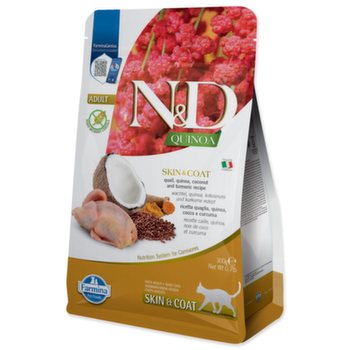 Vyvážené funkčné krmivo je určené pre dospelé mačky pri nežiaducej reakcii na potravu na vrátenie a udržanie zdravia kože a srsti. Hlavným zdrojom vysoko kvalitných bielkovín v krmive je hypoalergénna prepelica. Pridaná quinoa v bio kvalite pestovaná v Taliansku podporuje trávenie, absorpciu živín a celkovo zdravie tráviaceho traktu. Ďalej je bohatá na vzácne aminokyseliny a prírodné antioxidanty a má nízky glykemický index. Rybí olej zaručuje optimálny pomer omega-3 a omega-6 mastných kyselín pre dobrú kondíciu kože a srsti a ich regeneračnú schopnosť. Prídavok glukosamínu a chondroitínu vyživuje kĺbové chrupavky, stimuluje rast a ochraňuje kĺby. Krmivo neobsahuje obilniny, geneticky modifikované suroviny, umelé farbivá, bielkoviny zo sóje ani hormonálne alebo antibiotické rezíduá. Zloženie: prepelica (20 %), dehydratovaný proteín z prepelice (20 %), hrachový škrob, rybí olej (zo sleďa), quinoa semienka (8 %), ľanové semienko, sušený kokos (2,5 %), kurkuma (2,5 %), inulín, frukto mannanoligosacharidov), semená psyllium husk, uhličitan vápenatý, dikalcium fosfát, dihydrát síranu vápenatého, chlorid draselný, chlorid sodný, sušené pivovarské kvasnice, glukosamín, chondroitín sulfát. Zdroj proteínov: prepelica, dehydratovaný proteín z prepelice. Zdroj sacharidov: hrachový škrob, quinoa semienka. Analytické zložky: hrubý proteín 30%, hrubý tuk 16%, hrubá vláknina 2,3%, vlhkosť 8%, hrubý popol 6,8%, vápnik 1%, fosfor 0,8%, horčík 0,08%, omega-6 mastné kyseliny 2%, omega-3, mastné 0,3 %, glukosamín 1 200 mg/kg, chondroitín sulfát 900 mg/kg. Doplnkové látky na 1 kg: vitamín A 32 000 MJ, vitamín D 3 1 500 MJ, vitamín E 600 mg, vitamín C 300 mg, niacín 150 mg, D-panténol 50 mg, vitamín B 2 20 mg, vitamín B 6 8 1,5 mg, kyselina listová 1,5 mg, vitamín B 12 0,1 mg, cholín chlorid 2 500 mg, betakarotén 5 mg, chelát zinku hydroxy analógu metionínu 910 mg, chelát mangánu hydroxy analógu metionínu 380 mg chelát medi hydroxy analógu metionínu 88 mg, inaktivované kvasinky obohatené selénom 0,4 mg, DL-metionín 3 000 mg, taurín 3 000 mg, L-lyzín HCL 1 000 mg, L-cystín 700 mg, L-tryptop. Senzorické doplnkové látky: extrakt zo zeleného čaju 100 mg. Antioxidanty: extrakt s vyšším podielom tokoferolu prirodzeného pôvodu. Metabolizovateľná energia: 3 973 kcal/kg Kŕmny návod: