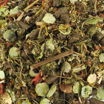 Zloženie: sušená vegetácia rastúca na trvalých pastvinách podhorí Álp, hrachové vločky 11,4 %, zelenina (sušená mrkva, sušená petržlen 2,1 %, sušený paštrnák, sušená červená repa), byliny (sušené kvety nechtíka lekárskeho 2 %, sušené sušená mäta pieporná 1,1%, sušená medovka, sušené púpavy, sušený harmanček), sušené jablká 4%, vločky z bôbu obyčajného 3,3%, sušená lucerna, ľanové semená, semená čiernej rasce, semená feniklu.