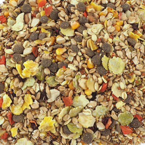Zloženie: pšeničné vločky, proso mana, proso la plata 14 %, kukurica 9 %, hrachové vločky 7 %, pšenica, kukuričné vločky, ovsené vločky, zelenina (sušená mrkva, sušená červená repa), semená tráv, arašidy, rý sušené kuracie 0,9%, sušené ryby), extrudovaná kukuričná múka, ľanové semeno, špalda, ovos, sušenie múčne červy.