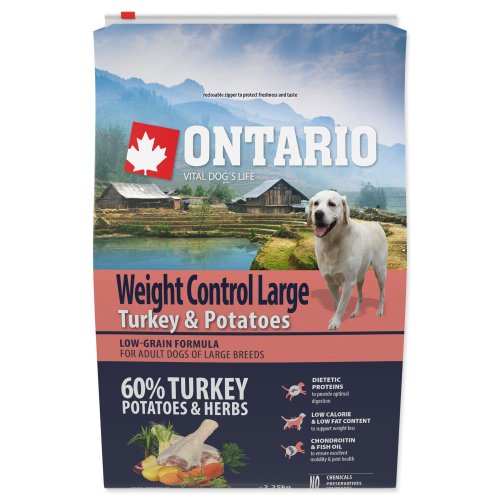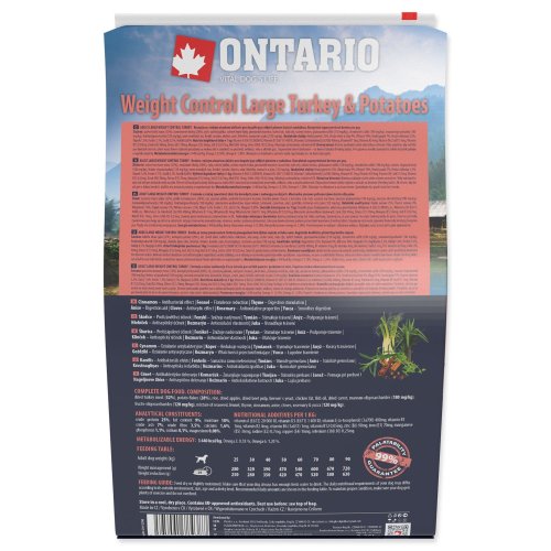 musia spĺňať všetky výživové a nutričné požiadavky pre zdravé fungovanie celého organizmu. Preto značka Ontario vyvinula v spolupráci s veterinármi a nutričnými špecialistami unikátnu a výnimočne chutnú receptúru, ktorá poskytuje vyvážené zloženie pre psov trpiacich nadváhou a správny pomer všetkých živín. Kvalitná strava je jednou z najdôležitejších podmienok pre zdravý a dlhý život Vášho psa. Receptúra založená na vysokom podiele kvalitných proteínov z morčacieho mäsa a na zemiakoch, ktoré sú po tepelnej úprave najlepším zdrojom sacharidu. Krmivo má znížený obsah tuku a energetickú hodnotu pre redukciu hmotnosti. Je vhodné aj na udržiavanie existujúcej váhy. S nízkym obsahom obilnín, bez pšenice alebo kukurice. Jedinou obilovinou je ryža. Vyvážené zloženie pre zdravé fungovanie celého organizmu. Chondroprotektíva a rybí olej na zabezpečenie zdravej pohybovej sústavy a kĺbu. Krmivo obsahuje špeciálny mix byliniek a korenia, najmä aníz, klinčeky a morské riasy, na udržanie správnej ústnej hygieny a zdravých zubov.