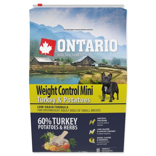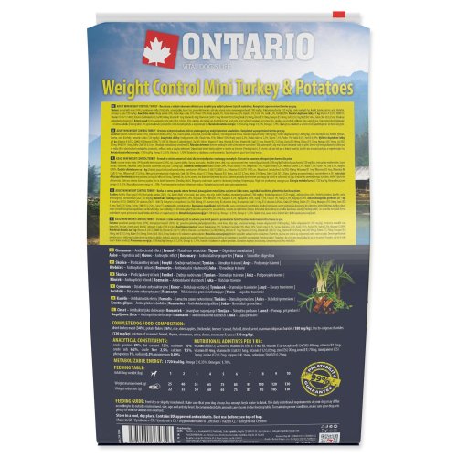 musia spĺňať všetky výživové a nutričné požiadavky pre zdravé fungovanie celého organizmu. Preto značka Ontario vyvinula v spolupráci s veterinármi a nutričnými špecialistami unikátnu a výnimočne chutnú receptúru, ktorá poskytuje vyvážené zloženie pre psov trpiacich nadváhou a správny pomer všetkých živín. Kvalitná strava je jednou z najdôležitejších podmienok pre zdravý a dlhý život Vášho psa. Receptúra založená na vysokom podiele kvalitných proteínov z morčacieho mäsa a na zemiakoch, ktoré sú po tepelnej úprave najlepším zdrojom sacharidu. Krmivo má znížený obsah tuku a energetickú hodnotu pre redukciu hmotnosti. Je vhodné aj na udržiavanie existujúcej váhy. S nízkym obsahom obilnín, bez pšenice alebo kukurice. Jedinou obilovinou je ryža. Vyvážené zloženie pre zdravé fungovanie celého organizmu. Krmivo obsahuje špeciálny mix byliniek a korenia, najmä aníz, klinčeky a morské riasy, na udržanie správnej ústnej hygieny a zdravých zubov.