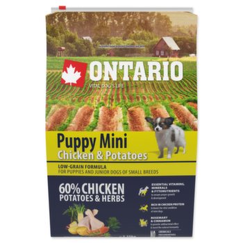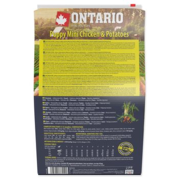 musia spĺňať vysoké výživové a nutričné požiadavky pre ich správny vývoj a rast. Preto značka Ontario vyvinula v spolupráci s veterinármi a nutričnými špecialistami unikátnu a výnimočne chutnú receptúru, ktorá poskytuje vyvážené zloženie, správny pomer všetkých živín a dostatok energie pre kvalitný štart Vášho šteňaťa do života. Kvalitná strava je jednou z najdôležitejších podmienok pre zdravý a dlhý život Vášho psa. Receptúra krmiva je založená na vysokom podiele proteínov z kuracieho mäsa dôležitých pre správny vývoj svalov a tkanív a na zemiakoch, ktoré sú po tepelnej úprave najlepším zdrojom sacharidu. S nízkym obsahom obilnín, bez pšenice a kukurice. Jedinou obilovinou je ryža. Vyvážené zloženie pre zdravé fungovanie a vývoj celého organizmu. Špeciálny mix byliniek a korenia, najmä rozmarín a škorica, na podporu prirodzenej imunity a poskytujúci antibakteriálny efekt. Krmivo obsahuje širokú škálu vitamínov a minerálov podporujúcich zdravý rast a vývin.