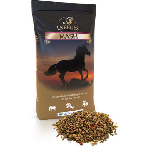 ENERGYS Mash je doplnkové krmivo bez obilnín (grain-free) pre všetky kategórie koní vrátane poníkov. Má vysoký obsah kvalitnej vlákniny a tuky s vysokým percentom nenasýtených mastných kyselín. Obsahuje probiotiká, prebiotiká a ďalšie látky podporujúce trávenie a zdravie čriev. Pomáha obmedziť výskyt črevných parazitov. Vhodné pre: hobby, strednú a vysokú záťaž, chovné kone, pomalá energia, sila a pony. Zloženie: pšeničné otruby, ľanové šupky, lucernové úsušky, jablčné výlisky, cukrovarské rezne, Sainfoin, Nutex, ľanový olej, úsušky bojinku lúčneho, hrachové šupky, sójový extrahovaný šrot, mrkvové vločky, probiotiká, prebiotiká. Analytické zložky: hrubý proteín 12,1 %, hrubý tuk 8 %, hrubá vláknina 19,5 %, hrubý popol 8,5 %, vápnik 0,7 %, fosfor 0,6 %, horčík 0,3 %, sodík 0,5 %. Doplnkové látky na 1 kg: Nutričné: vitamín A 11 800 oi , vitamín D 3 2 102 oi , vitamín E 338 mg, vitamín C 285 mg, síran meďnatý pentahydrát 35 mg, síran železnatý monohydrát 164 mg zinočnatý monohydrát 169 mg, filmom obalený granulovaný bis (uhličitan) kobaltnatý 2 mg, jodid vápenatý 1 mg, seleničitan sodný 0,6 mg. Zootechnické: Saccharomyces cerviseae 375 McFu/K/, Saccharomyces cerviseae 375 McFu/K, Saccharomyces cerviseae 375 McFu/K/, Saccharomyces cerviseae 375 McFu/K/. Senzorické aditíva: jablčná aróma. Forma: mash Odporúčané denné dávkovanie: 2 kg pre dospelého koňa (500 kg ž. h.) Namáčajte vlažnou vodou v pomere 1,5–2 diely vody na 1 diel MASH. Dávku je nutné prispôsobiť plemenu, veku a kondícii koňa. Je možné skrmovať dlhodobo bez obmedzenia.