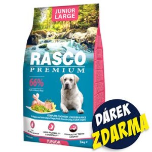 Krmivo Rasco Premium Junior Large kura s ryžou 3kg + Pochúťka Rasco Premium 80g