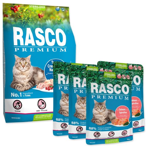Krmivo Rasco Premium Sterilized tuniak s brusnicou a kapucínkou 2kg+Krmivo 0,4kg ZADARMO