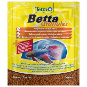 Tetra Betta Granules – nutrične vyvážené krmivo pre bety bojovníčky. Vysoko chutné plávajúce granule s látkami podporujúcimi prirodzenú farbu, ktoré zaisťujú krásne sfarbenie. Obohatené vitamínmi a živinami na posilnenie imunitného systému. Nekalia vodu. Použitie: Kŕmte takým množstvom, aby vo vode nezostávali zvyšky potravy. Zloženie: Ryby a výrobky z rýb, obilniny, sušené kŕmne kvasnice, mäkkýše a kôrovce, vajcia a výrobky z vajec, oleja a tuky, cukor, riasa, lecitín. Veľkosť balenia: 5 g
