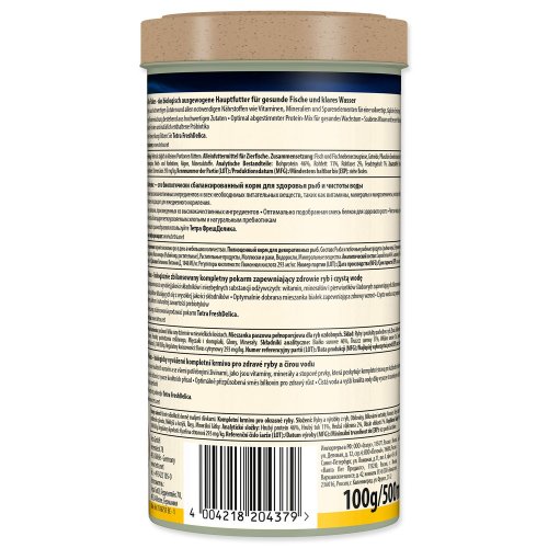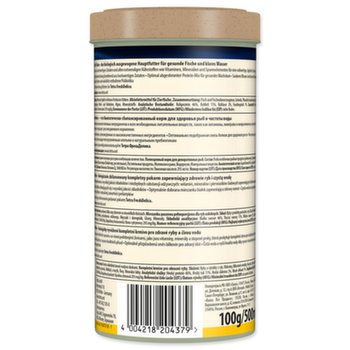 Kompletné vločkové krmivo pre všetky druhy okrasných rybiek. Obsahuje 40 starostlivo vybraných, vysoko kvalitných surovín, zahrňujúcich všetky významné živiny pre život, vitamíny a stopové prvky. Posilňuje obranné mechanizmy ich organizmu, kladne ovplyvňuje stavbu kostry a napomáha rastu. Obsahuje stabilné množstvo vitamínu C.