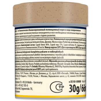 Zloženie: ryby a vedľajšie výrobky z rýb, obilniny, kvasnice, bielkovinové extrakty rastlinného pôvodu, mäkkýše a kôrovce, oleje a tuky, cukor, riasy.