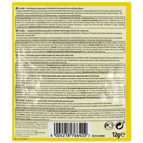 Zloženie: ryby a vedľajšie výrobky z rýb, obilniny, sušené kŕmne kvasnice, vedľajšie výrobky rastlinného pôvodu, mäkkýše a kôrovce, oleje a tuky, riasy, cukor, lecitín.