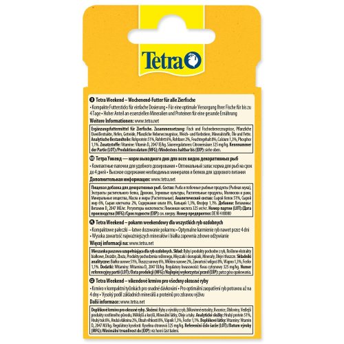 Kompletné krmivo pre okrasné akváriové ryby. Tetra Weekendfutter pomaly klesá ku dnu a tak umožňuje rovnomerné kŕmenie vašich rýb. Tetra Weekendfutter úplne neobsahujú umelé spojivá, napríklad sadru.