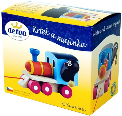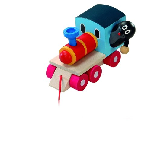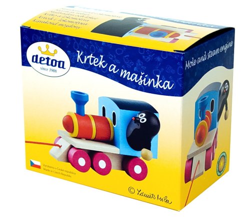 Ťahacia drevená mašinka s krtkom ako rušňovodičom. Nevhodné pre deti do 3 rokov. Obsahuje malé časti. Výrobok je zdravotne nezávadný.