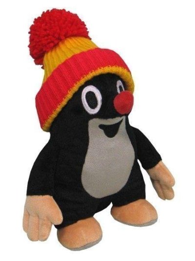 Plyšový Krtko s pletenou odnímateľnou čiapkou.