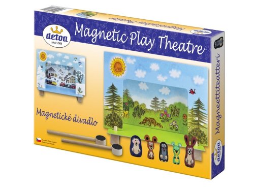 Magnetické divadlo Krtka a jeho kamarátov obsahuje podstavce, dvoje kulisy z tvrdého papiera, dvoje vodiace paličky a 5 drevených figúrok. Balené v krabici z tvrdého papiera. Nevhodné pre deti do 3 rokov. Obsahuje malé časti. Výrobok je zdravotne nezávadný.