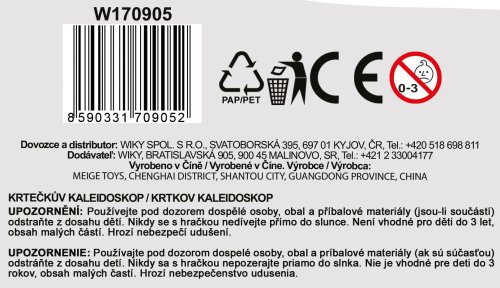 Aj Krtko chce vidieť svet farebný. Kaleidoskop alebo krasohľad, je detská hračka, ktorá pomocou sústavy zrkadiel a farebných teliesok vytvára neopakovateľné obrazce pri pohľade proti svetlu. Kaleidoskop s motívom Krtka si deti priam zamilujú. Rozmery balenia 14 x 28 x 3 cm. Vhodné pre deti od 3 rokov.