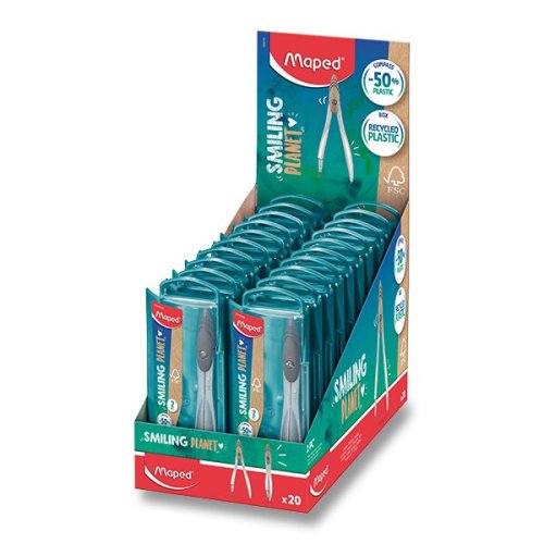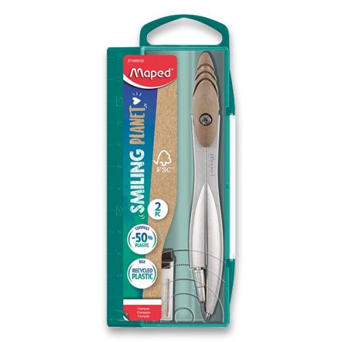 Kovové kružítko Maped Smiling Planet Study s ergonomickým úchopom, ktorý je vyrobený z 50% zmesi drevného vlákna s certifikáciou FSC.