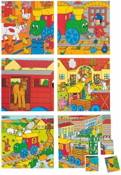 Šestnásť kociek, ktoré poskladaním vytvoria jeden zo šiestich obrázkov.