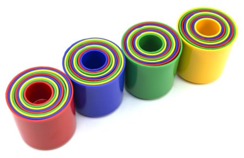 Kubus obsahuje deväť kalíškov rôznych farieb, ktoré do seba zapadajú.