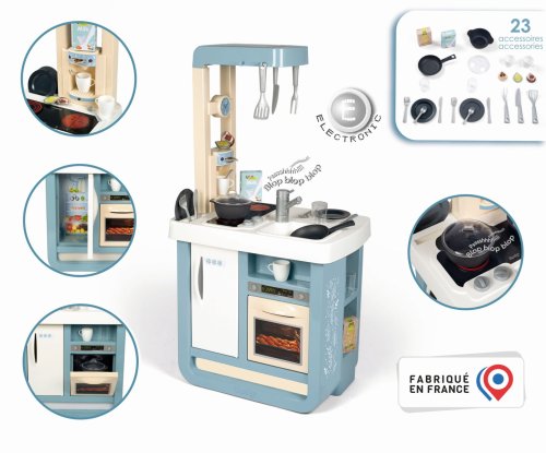 Kuchynka Bon Appetit v modernom dizajne s množstvom kuchynského príslušenstva, 23 príslušenstva. Kompaktná a realistická detská kuchynka, ktorá je celá navrhnutá v modernom dizajne súčasných kuchýň. Vďaka krásnemu sfarbeniu v jemných pastelových tónoch sa hodí do detskej izby aj do spoločnej obývacej izby. Kuchynka má sporák s dvoma platničkami, rúru a digestor. Elektronický zvukový modul v jednej z platničiek poskytuje realistické zvuky varenia. Výbavu dopĺňajú chladničky, drez s kohútikom a espresso kávovar s rôznymi kapsulami na čaj a kávu. Rozsiahle príslušenstvo je možné ľahko uložiť do jednej z mnohých políc. Súčasťou vybavenia je rajnica s pokrievkou, tanier, príbory, riad, makety obalov od jedla, hrnček, hrnček a panvicu. Výška pracovnej plochy: 48,5 cm. Rozmery produktu (DxŠxV): 52,1 x 32,5 x 95,7 cm.