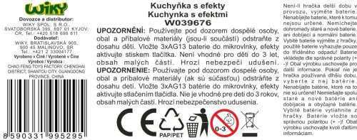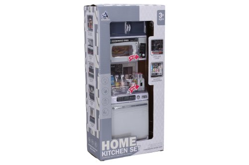 Kuchynka s efektmi. Rozmery 10,5 x6, 5x30 cm. Svetelné a zvukové efekty tlačidlom na mikrovlnke. 3xAG13 batérie do mikrovlnky súčasťou. Obsah - umývačka riadu, mikrovlnka, skrinka, hriankovač, riad, jedlo, nápoje.