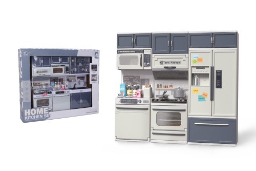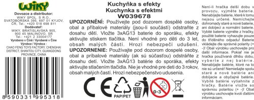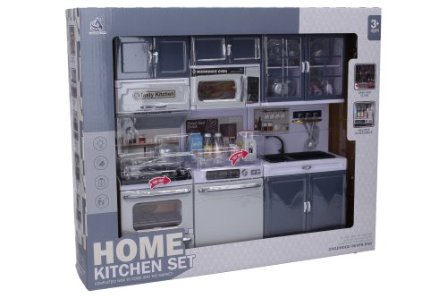 Kuchynka s efektmi. Rozmery 34x7x30 cm. Svetelné a zvukové efekty tlačidlom na sporáku. 3xAG13 batérie do sporáka súčasťou. Obsah - rúra so sporákom, odparovač, umývačka, mikrovlnka, drez, skrinky, hriankovač, riad, jedlo, nápoje.