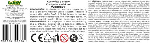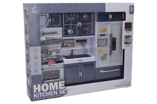 Kuchynka s efektmi. Rozmery 36x7x30 cm. Svetelné a zvukové efekty tlačidlom na sporáku. 3xAG13 batérie do sporáka súčasťou. Obsah - rúra so sporákom, odparovač, drez, chladnička, skrinky, riad, jedlo.