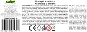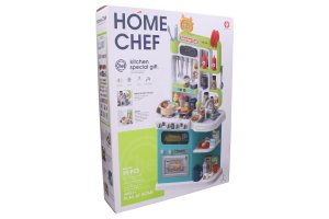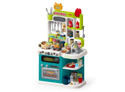 Kuchynka s efektmi. Veľkosť zostavenej kuchynky 44,5x24x92 cm. Návod na zloženie na obale. 3xAA batérie nie sú súčasťou balenia. Súčasťou kuchynky je drez, rúra, mikrovlnka, varič, polica. Balenie obsahuje bohaté príslušenstvo do kuchyne-riad a potraviny. Drez je možné naplniť vodou a po stlačení páčky na vodovodnom kohútiku z neho strieka voda. Po naliatí vody do variča vychádza para. Svetelné a zvukové efekty.