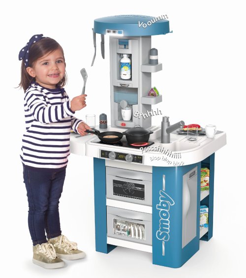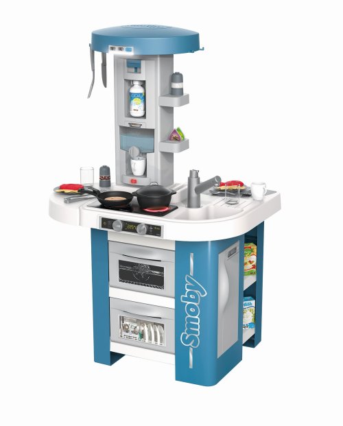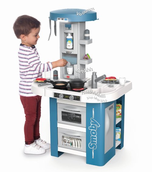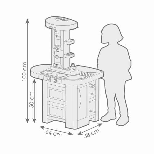 Stabilná kuchynka Studio Tech Edition je kompaktná, stabilná kuchynka s mnohými extra elektronickými funkciami. S veľkou hernou plochou 360 ° - je možné sa hrať zo všetkých strán. Kuchynská doska je vybavená elektronickou varnou doskou s dvoma rôznymi zvukmi varenia a červeným osvetlením. Kávovar má plniteľnú nádržku na vodu, pomocou ktorej je možné cez ventil plniť vodu do šálok. Po stlačení tlačidla sa objaví blikajúce svetlo, ktoré napodobňuje zahrievanie prístroja, a keď tlačidlo znovu stlačíte, budete počuť realistický zvuk prístroja na espresso. Digestor má tri rôzne úrovne hluku a taktiež svetelnú funkciu. Kuchynka má tiež rúru, umývačku riadu, chladničku, drez s kohútikom, automat na sódu a niekoľko úložných priestorov. Obsahuje 35 zábavných doplnkov: cestoviny, ktoré v studenej vode menia farbu, panvičku na ľahké palacinky, kávové kapsule, ryby a steaky, soľničky a koreničky so zvukom „cvaknutie“, panvice, kuchynské náčinie, riad, príbory, hrnčeky, okuliare atď. 100 cm.