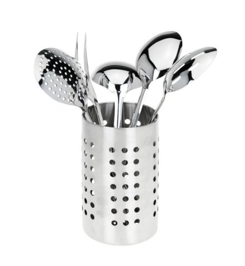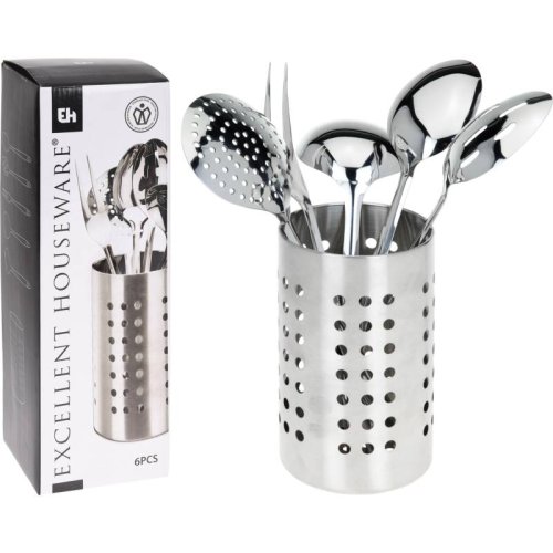 praktická sada kuchynského vybavenia v stojane - najčastejšie používané kuchynské pomôcky pri varení, máte prehľadne v jednom stojane vždy po ruke - materiál kuchynského náčinia: nerezová oceľ - sada 6 ks obsahuje: - vidlička 32 cm - lyžica 33 cm - dierované lyžice 33 cm - naberačka 28,5 cm- pěnovačka 32 cm- držiak na náčinie pr. 10,5 x 18 cm - držiak možno použiť aj ako odkvapkávač