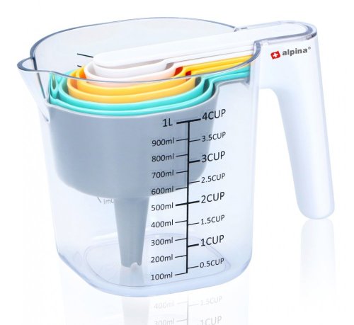 9dielna sada odmeriek od Alpiny nesmie chýbať v žiadnej kuchyni. Vďaka technológii stohovania nielen šetrí miesto, ale je aj všestranná. Veľká odmerka má metrické značenie a má kapacitu 1 liter. 6 malých odmeriek má kapacitu 7,5...250 ml. Dodávka obsahuje lievik a škrabku. Vlastnosti: - 9dielna, priestorovo úsporná sada - Veľká odmerka s objemom 1 l - 6 malých odmeriek: 7,5 ml, 15 ml, 60 ml, 85 ml, 125 ml, 250 ml - Súčasťou dodávky je lievik a škrabka - Rozmery (DxŠxV ): 188x110x133 mm