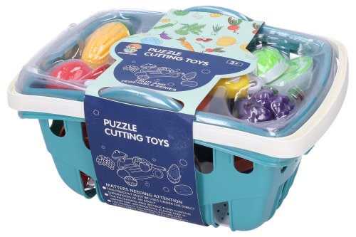 Kuchynský set v košíku - modrý. Rozmery košíka 26x19x14 cm. Obsahuje rozkrojené ovocie a zeleninu, nôž a ďalší riad.