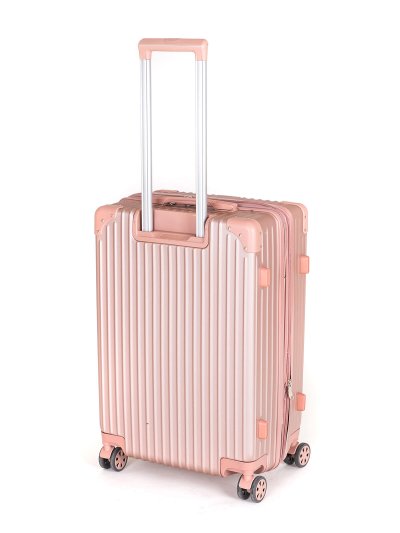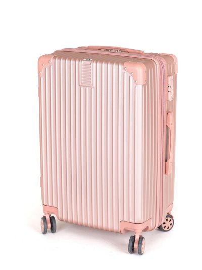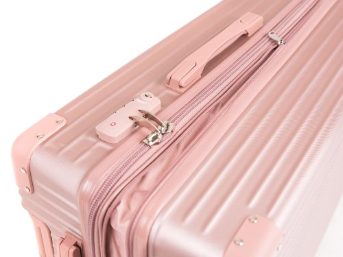 Cestovný škrupinový kufor na kolieskach ABS25, so spevnenými rohmi, veľkosti M, v zlatoružovej farbe, je vyrobený z kvalitného plastu ABS, ktorý je odolný proti nárazu. Je opatrený 4 dvojitými kolieskami otočnými o 360 stupňov, vďaka ktorým je manipulácia s kufrom veľmi jednoduchá. Kufor má 3 plastové madlá: bočné a dve horné, z ktorých je jedno s teleskopickou rukoväťou s poistkou proti zasunutiu a možnosťou nastaviteľnej výšky vo viacerých polohách. Kufor sa uzatvára na zips a oboch jazdcov môžete spojiť do kódového zámku TSA, ktorý veľmi uvítate pri náhodných kontrolách na letisku. Vnútorná časť kufra má látkovú deliacu prepážku s vreckom a krížové upínanie pre lepšiu fixáciu a usporiadanie vašich vecí. Kufor je vybavený expanderom, vďaka ktorému je možné po rozopnutí 1 zipsu kufor rozšíriť do hĺbky o niekoľko cm a objemovo tak zväčšiť priestor až o pätinu.