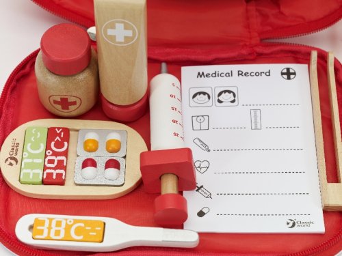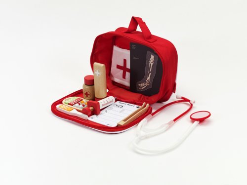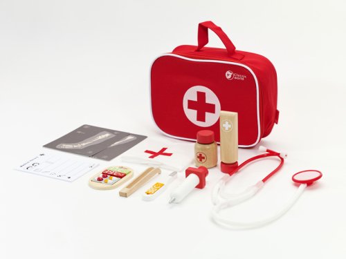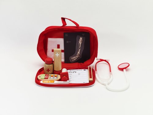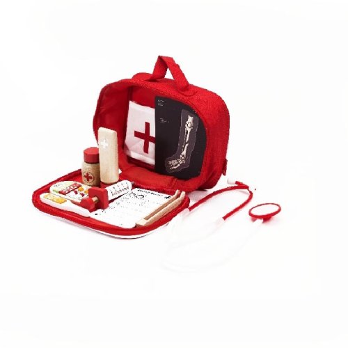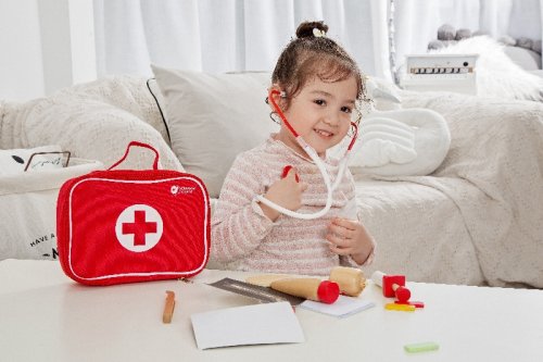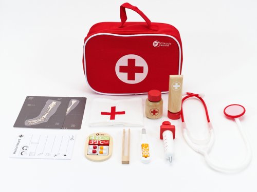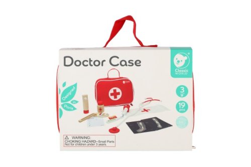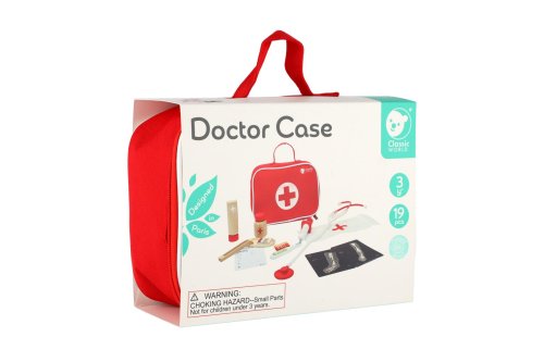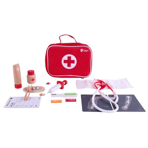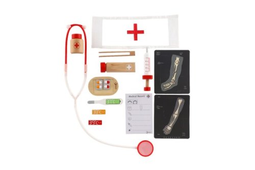 Všetko, čo potrebuje doktor nabehnete v tomto sete. Stačí si vziať stetoskop (plastový) a môžete začať liečiť. V sade je množstvo drevených doplnkov, aby hra bola zaujímavejšia a dokážete tak vyliečiť každú bolístku. Súprava obsahuje 19 ks. Rozmery balenia 22 x 17 x 8 cm. Vhodné pre deti od 3 rokov.