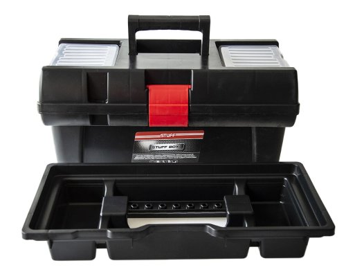Kufor na náradie STUFF PROFI je vyrobený z kvalitného plastu, vo vrchnej časti sú dva organizéry pre drobné súčiastky uzavreté vekom, pripravený aj otvor pre visiaci zámok."