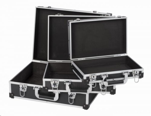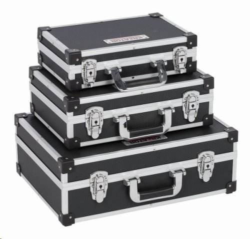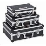 Súprava čiernych hliníkových kufrov KRT640401B 3v1 značky Kreator obsahuje tri kufre s rozmermi malého 330 x 210 x 90 mm, stredného 380 x 260 x 120 mm a veľkého 460 x 330 x 160 mm. Pevné boxy obsahujú polstrovanie bez priehradok, ľahko tak uložíte aj väčšie kusy náradia.