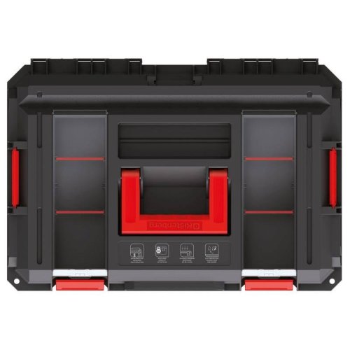 • vo vekách vybraných kufrov na náradie sú zabudované hliníkové koľajnice, ktoré umožňujú transformáciu kufra na kompaktný a stabilný stôl vhodný na dielenské práce.