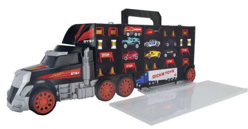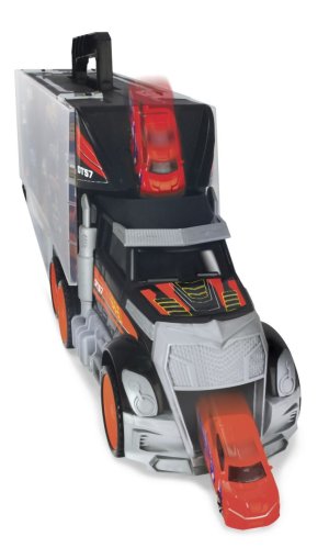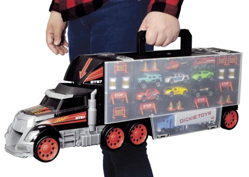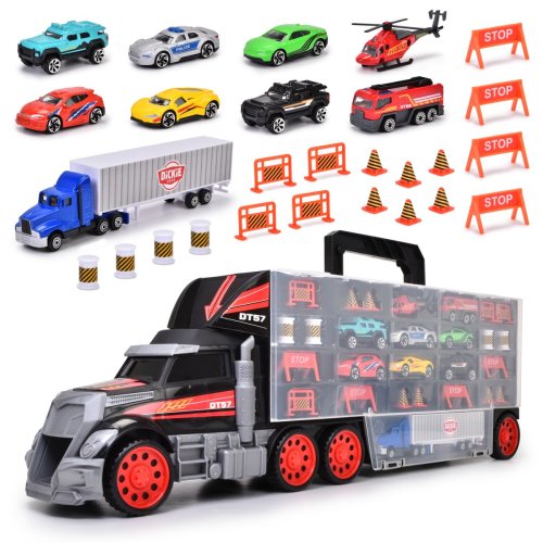 Veľká súprava s príslušenstvom v tvare kamiónu, s rukoväťou. Vrátane 7 kovových autíčok, nákladného auta a vrtuľníka. S manuálnou vystreľovacou funkciou z kabíny kamiónu. Dĺžka 62 cm.
