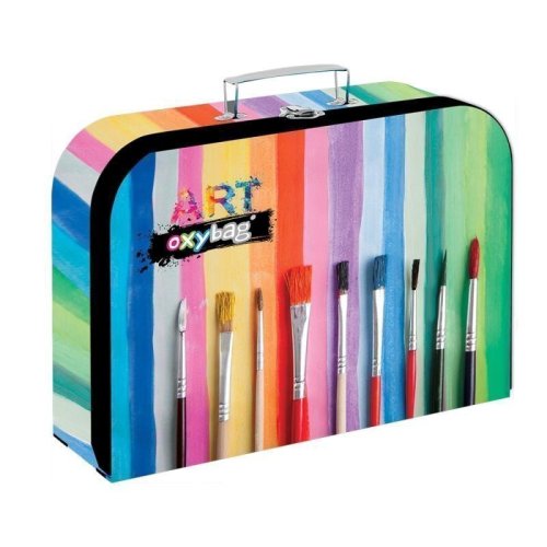 Lamino kufrík na výtvarnú výchovu. Do kufríka sa zmestí formát A4. Materiál: papier, lepenka, kovový kaštieľ, kovové nity.