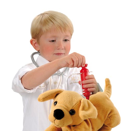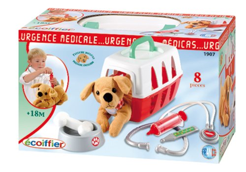 Kufrík pre malého veterinára s príslušenstvom a psíkom. Kufrík je možné použiť ako prepravný box pre psíka a tiež na uskladnenie príslušenstva. Súčasťou napr. miska pre psíka, kosť, lekárske vybavenie. Rozmery kufríka: 24 x 15 x 14 cm.