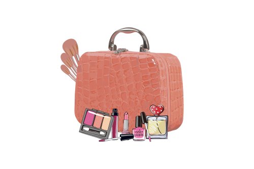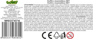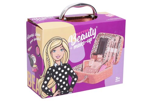 Kufrík s kozmetikou. Veľkosť 19 cm. Obsahuje zrkadlo, umelé nechty, lesk na pery, tvárenku, očné tiene, pilníky na nechty, sadu štetcov, balzam na pery, očné linky, trblietavé dekorácie.