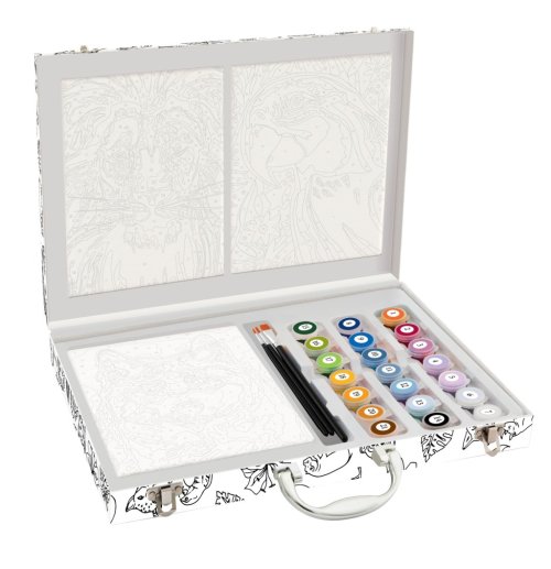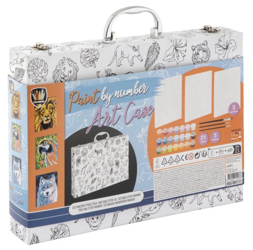 Kufrík s maľovaním podľa čísel obsahuje predtlačené obrázky na plátne (3 ks – lev, papagáj a vlk) s číslami, 21 očíslovaných farieb, 2 okrúhle a 1 plochý štetec. Veľkosť kufríka 35×25 cm.