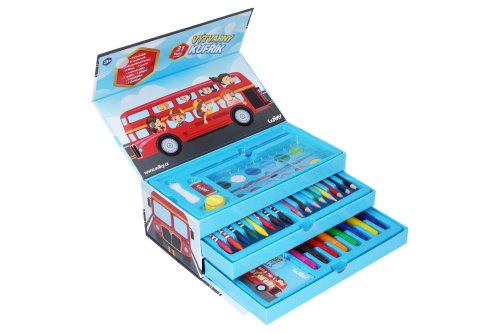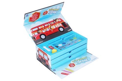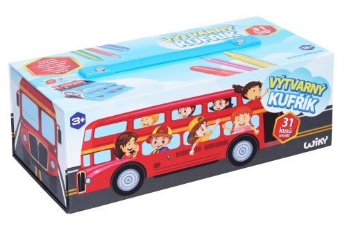 Kufrík výtvarných potrieb Autobus Obsahuje: 8 pasteliek, 8 voskoviek, 1 akvarelovej farby, 8 fixiek, 1 guma, 1 strúhadlo, 1 ceruzka, 1 štetec, 1 hubka, 1 denníček