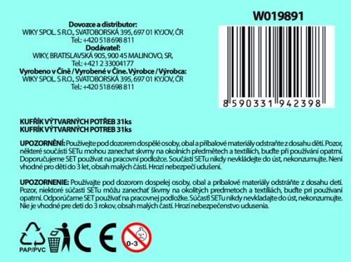Kufrík výtvarných potrieb Autobus. Obsahuje: 8 pasteliek, 8 voskoviek, 1 akvarelovej farby, 8 fixiek, 1 guma, 1 strúhadlo, 1 ceruzka, 1 štetec, 1 hubka, 1 denníček. Môže sa stať, že nejaký fix nepíše.