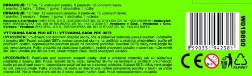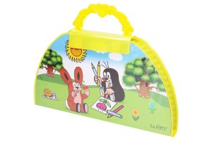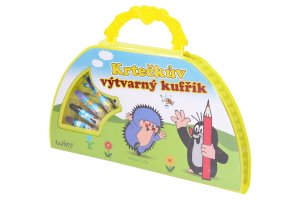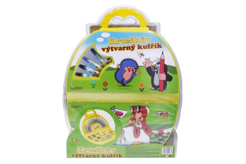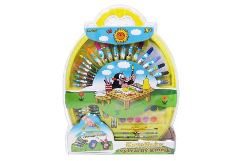 Kufrík výtvarných potrieb 50 ks Krtko. Obsahuje: 12 fixiek, 12 voskových pastelov, 6 pasteliek, 12 vodových farieb, 1 pravítko, 2 ceruzky, 1 štetec, 1 guma, 1 strúhatko, 1 nožnice.
