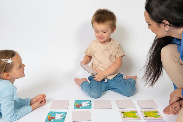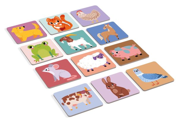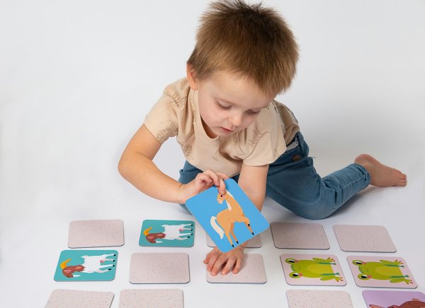 Pre najmenších hráčov je možné začať s kartami vyloženými lícom nahor, rôzne zamiešané. Učte deti postupne združovať kartičky a priraďovať správne jednotlivé dvojice. Vyberte si 3 rôzne dvojice zo sady a položte ich lícom nahor. Postupne rozširujte počet dvojíc: 6 dvojíc, 9 dvojíc a potom všetkých 12 párov.