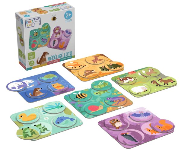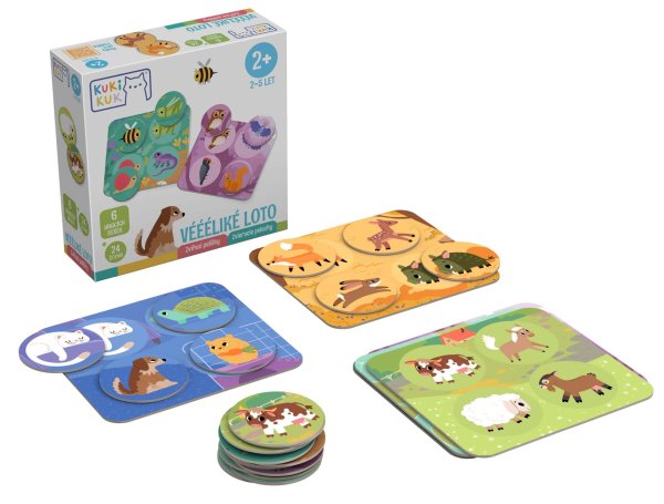 Vééliké loto Zvieracie pelechy, je obľúbená zábavná detská hra, ktorá predstaví batoľatám 24 zvieratiek v ich pelechoch: na lúke, v lese, vo vode... Hra obsahuje 24 veľkých okrúhlych žetónov a šesť hracích dosiek z 2 mm hrubého kartónu.