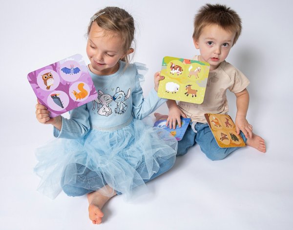 Pozrite sa na prvú dosku spoločne. Ukážte na zviera prstom a pomenujte ho. Cieľom je, aby dieťa správne pomenovalo všetky zvieratká. Môžete skúsiť napodobniť zvuky, ktoré zviera vydáva: mačka mňauká, psík šteká, žaba kváka a kuňká. Svojím pohybom môžu zvieratká vydávať aj rozličné zvuky: včielka bzučia, rybka šplouchá, koník klape kopýtky atp.